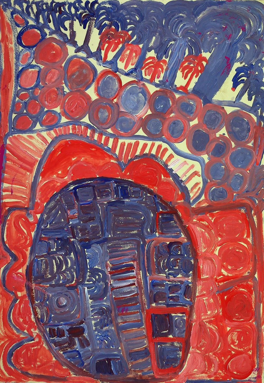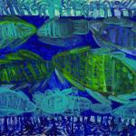Sonia paints the sandy billabong country along the stretch of the Fitzroy River that runs directly behind the community. After the floodwaters recede, there are billabongs that hold a plentiful supply of parlka [barramundi], kurlumajarti [catfish] and bream. She paints gapi [fish], parrmarr [rocks] where the fish is cooked, ngurti [coolamon] and a karli [boomerang].